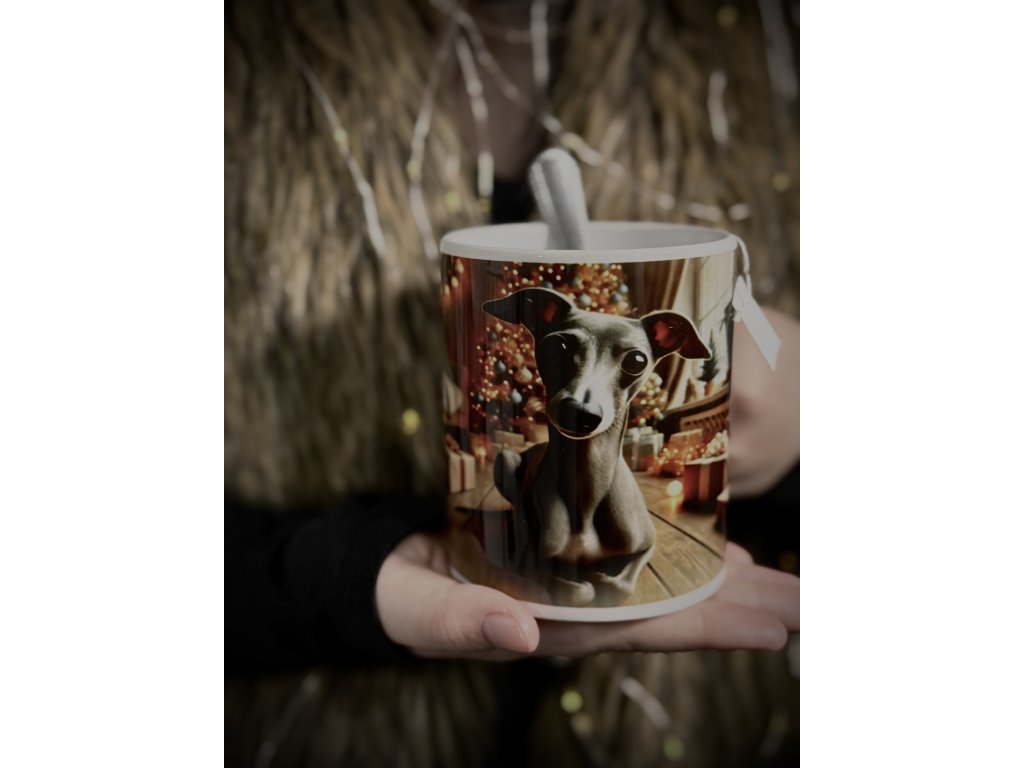 S motivem roztomilých chrtíků obklopených vánoční výzdobou, dárky a slavnostními dekoracemi je ideálním společníkem na zimní rána nebo chladné večery u horkého nápoje.