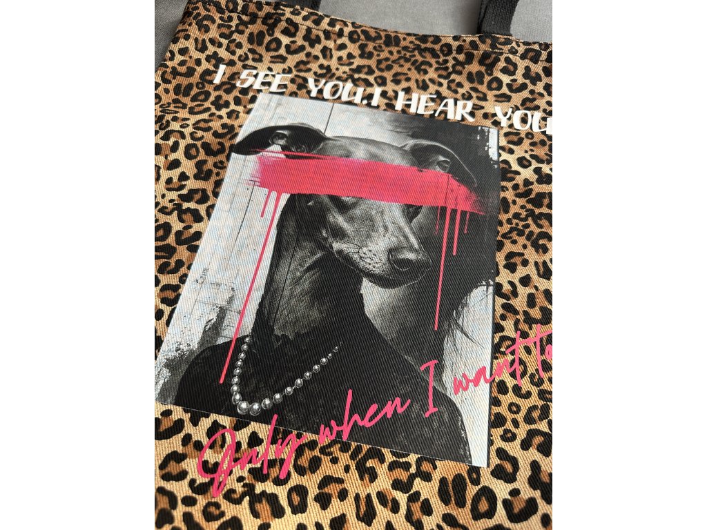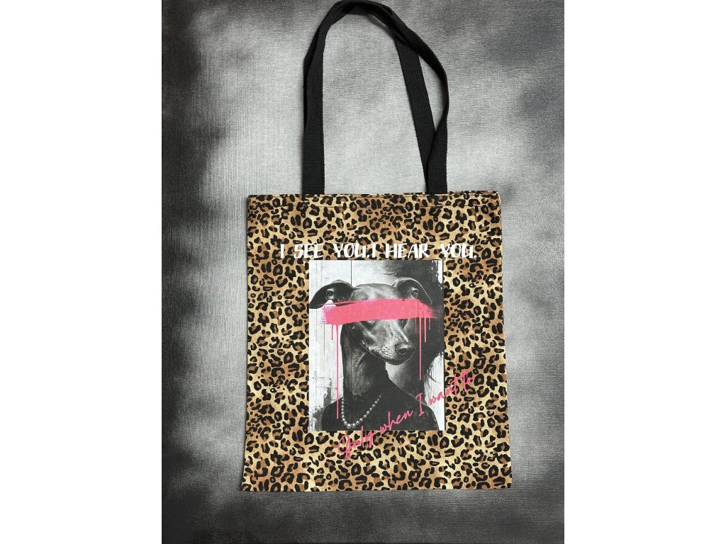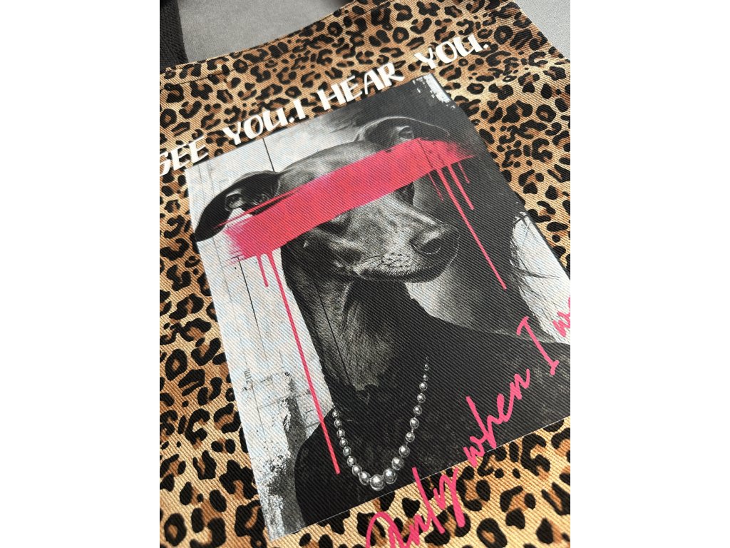 Taška Leopard Glam kombinuje drzou eleganci leopardího vzoru s ikonickým portrétem italského chrtíka.