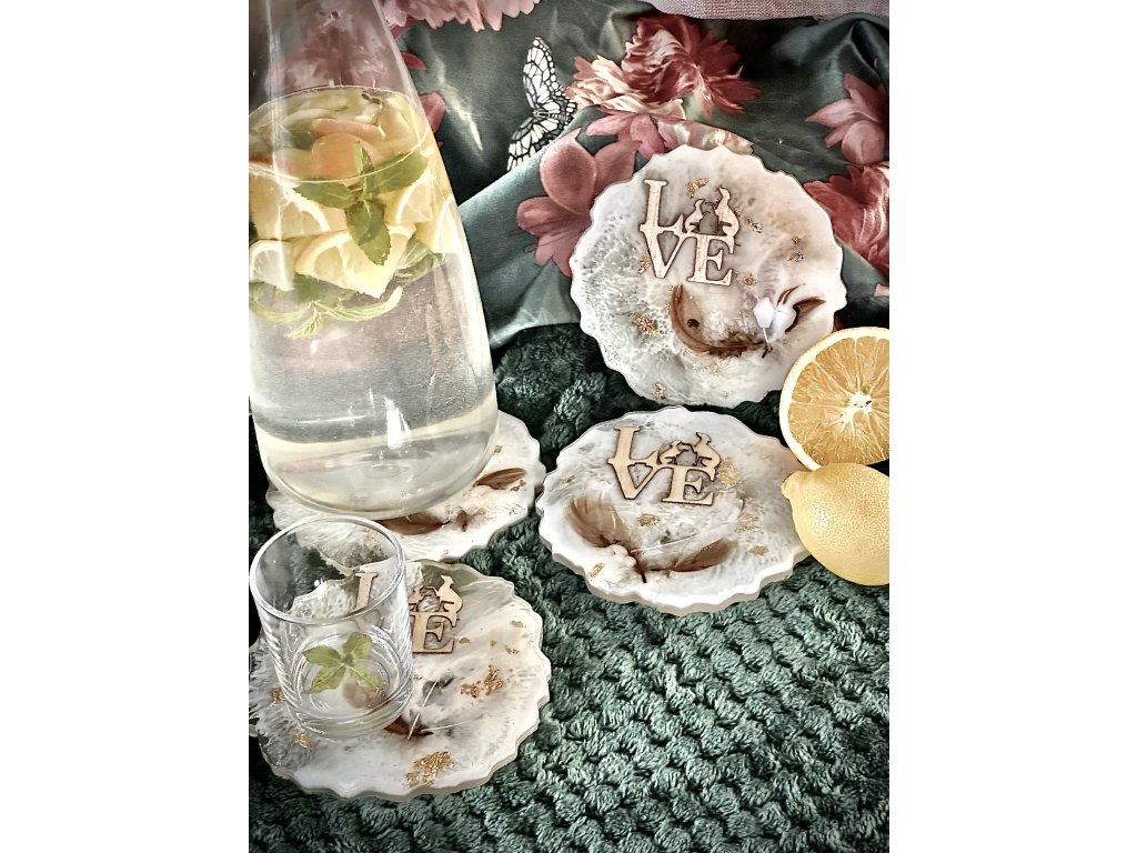 Podtácky z epoxidové pryskyřice italský chrtík LOVE - velké- set 4ks, bílo-hnědo-zlaté s peříčky.